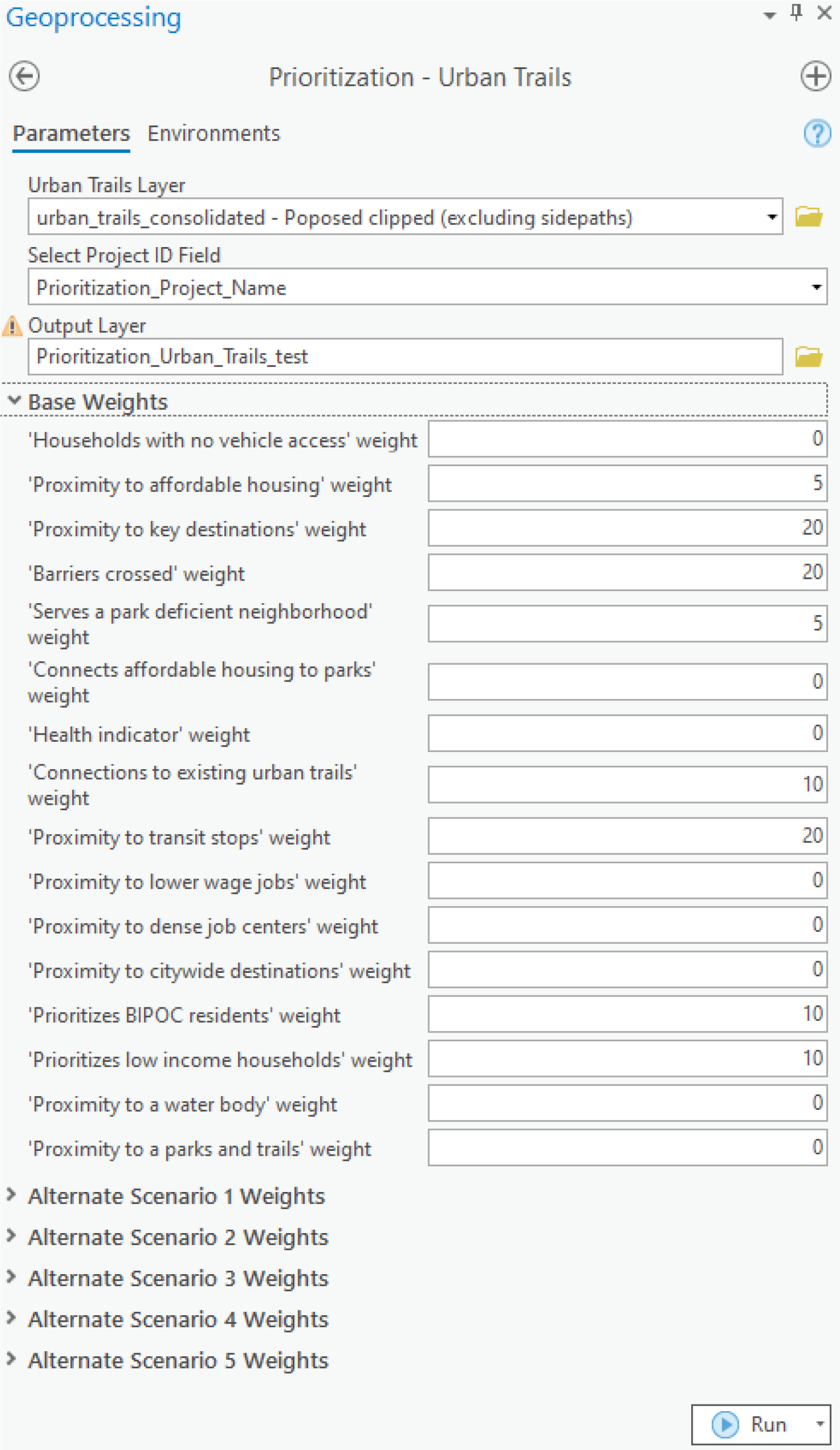 Finally, we developed four prioritization tools to help the City invest resources in areas with the most need. Each tool uses different input variables and allows users to adjust the weight of each variable. The tools connect up to 18 input datasets to a given set of proposed project locations, and they assign prioritization scores to each location.