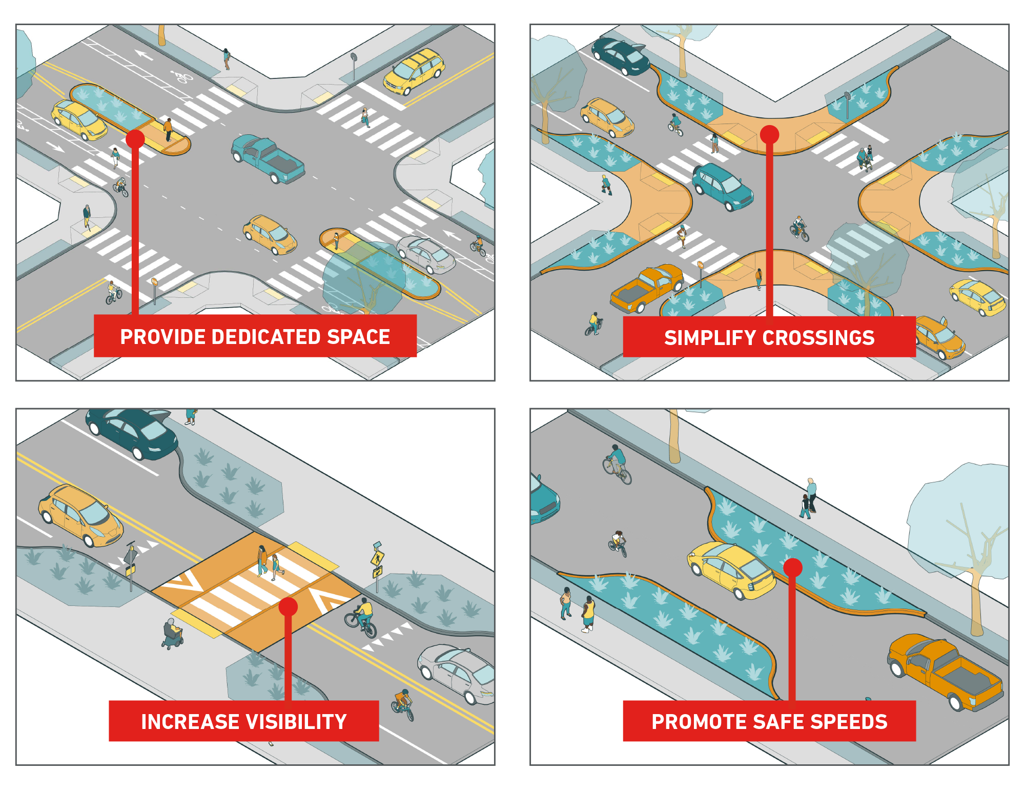 Build environments that address the safety needs of children and youth. Environments where children travel by foot or bike — in neighborhoods, to schools, and to parks — warrant extra attention to build facilities that counteract children’s vulnerabilities. In our 20 years of experience in creating SRTS infrastructure plans, we’ve determined four key strategies that result in the most impactful youth safety outcomes: