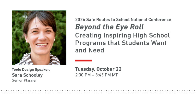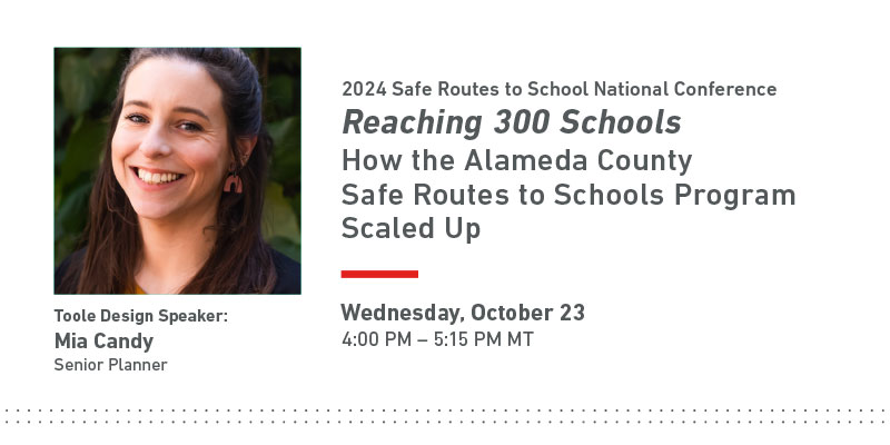 We’re looking forward to the 2024 Safe Routes to School National Conference, being held October 22–24 in Fort Collins, Colorado. Toole Design staff will share highlights from recent projects, including tailoring Safe Routes to School (SRTS) programs for high schoolers, developing equitable engagement strategies in Colorado, and building cross-sector partnerships to scale up the Safe Routes Program in Alameda County. We’ve also organized a can’t-miss panel of top SRTS experts who are leading the way in integrating youth travel concerns into broader transportation planning efforts.
