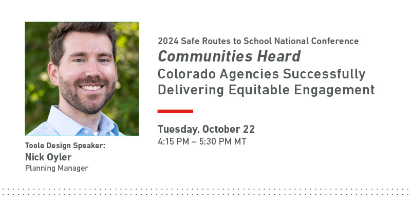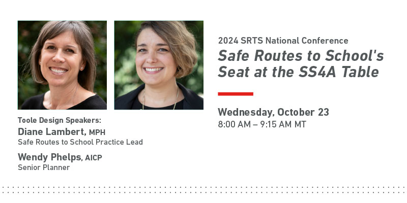 We’re excited for this opportunity to learn and share how we’ve been making SRTS strides to help children and youth to walk, bike, and roll safely and joyfully. Please reach out if you’d like to set up a time to meet with a Toole Design presenter. See you in Fort Collins!