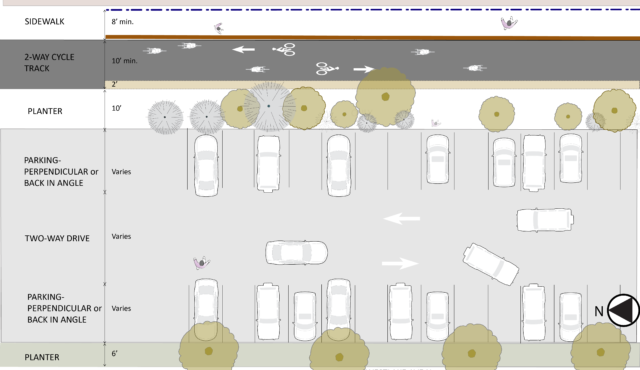 The resulting bike lane provides a comfortable experience for people walking, biking, conducting business, and accessing the marina.