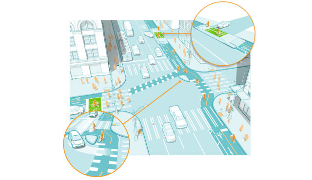To reduce motor vehicle speeds at conflict points, our concept called for raising the height of the bikeway and extended the driveway apron out into the buffer, as well as reducing the turning radius at protected intersections.