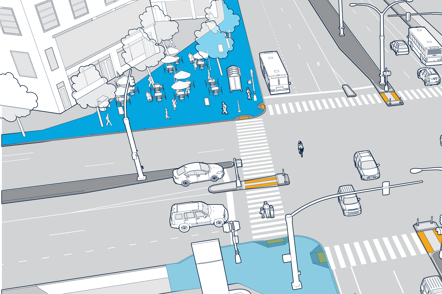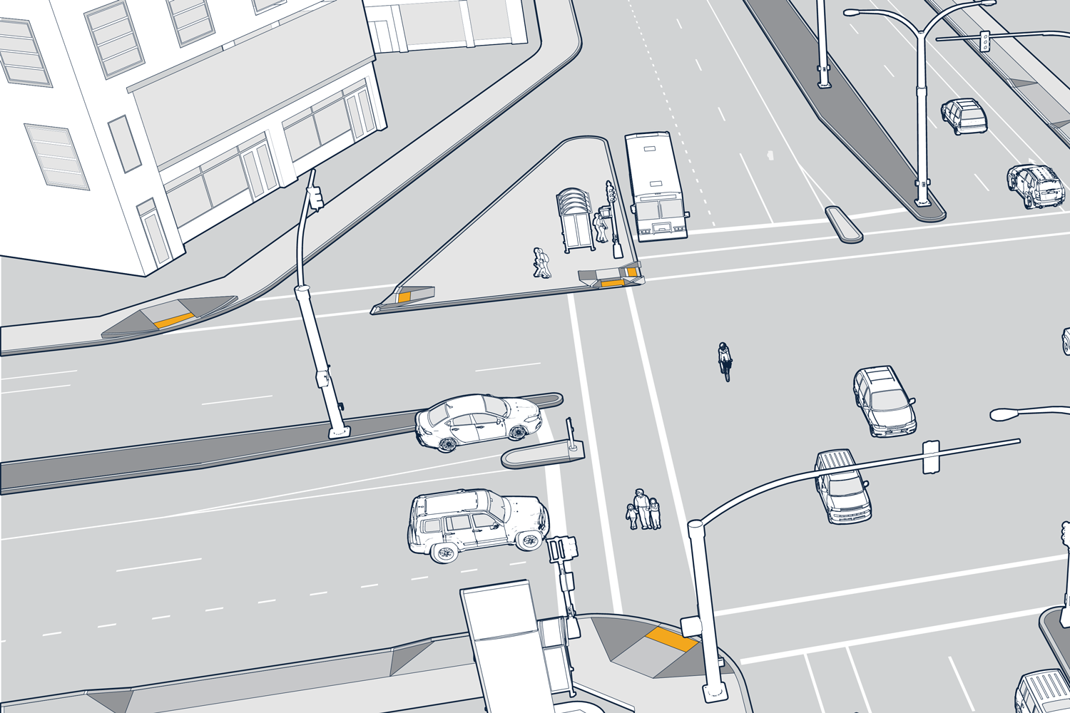 The Pedestrian Safety Toolbox provides a series of improvements that make walking safer, more accessible, and more enjoyable. Here, a reimagined right-turn lane illustrates how the design can help slow motorist speeds, improve visibility of pedestrians, and reduce the crossing distance.